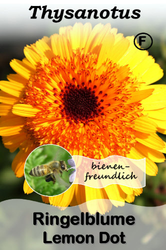 Diese kräftig goldgelben, halb gefüllten Ringelblumen mit einem schwarzen Punkt in der Blütenmitte der 8 cm großen scheibenförmigen Blüten leuchten auch bei bedecktem Wetter von Weitem gut sichtbar in Beeten und Rabatten.
