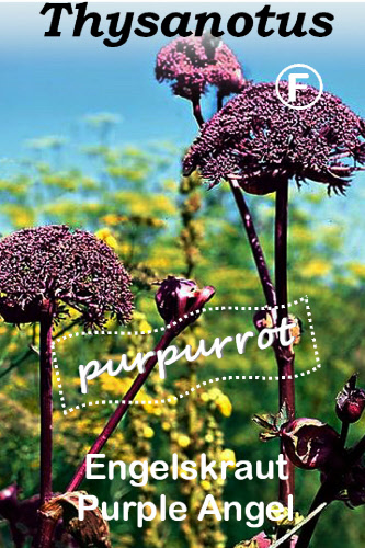 Ein neues, magisches hohes Engelskraut mit purpurroten Blättern, lilafarbenen Schirmdolden-Blüten und einem Duft von Möhren. Die essbaren Wurzeln sind medizinisch vielseitig zu verwenden. Sehr gut geeignet für den hinteren Bereich in Beeten. Leichte Kultur und lang blühend.