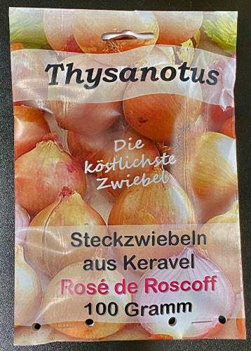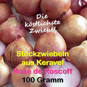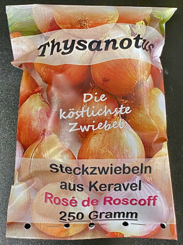 Eine Rosé-Sorte aus der Bretagne, die bei Feinschmeckern wegen ihres Aussehens, ihrer schmelzenden Textur und ihres fruchtigen Geschmacks sehr beliebt ist. Große runde Knolle, rosa Schale, weißes Fruchtfleisch, saftige, süße, süße und würzige Aromen, gute Konservierung. Diese Sorte, die seit dem 17. Jahrhundert in der Region Roscoff angebaut wird und für ihre konservierenden Eigenschaften und ihren Reichtum an Vitamin C bekannt ist, wurde zur Bekämpfung von Skorbut eingesetzt. Ab 1850 boten die Johnnies den Engländern diese berühmte Variante an, in loser Schüttung oder geflochten, und sehr oft auf Fahrrädern. Diese Zwiebeln werden in der Bretagne, in der Nähe von Roscoff, ihrer Herkunftsregion, hergestellt.
